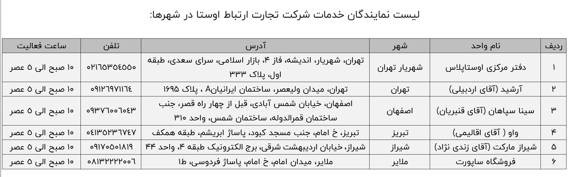 شركت تجارت ارتباط اوستا به شماره ثبت 7190 دارای مجوز واردات گوشی تلفن همراه با برند های شیائومی ، وانپلاس و اوپو و تبلت با برند های اپل ، سامسونگ ، شیائومی ، لنوو و هوآوی از سازمان حمایت مصرف کنندگان و تولید کنندگان می باشد. این شرکت در سال 97 با هدف واردات رسمی و ارائه خدمات پس از فروش گوشی و تبلت های برند کشور چین تاسیس و اعضای هیئت مدیره آن بیش از 7 سال سابقه موفق در زمینه پخش تلفن همراه در کشور را دارند.